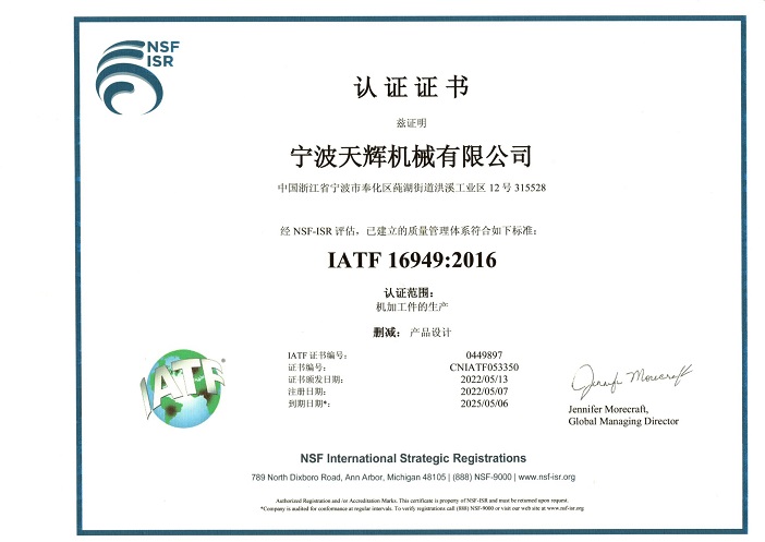 天輝通過(guò)了IATF16949:2016 質(zhì)量管理體系認(rèn)證。公司內(nèi)的進(jìn)料流程、生產(chǎn)流程、生產(chǎn)工藝、出貨流程等精密鑄造加工都是按照IATF16949質(zhì)量標(biāo)準(zhǔn)執(zhí)行,嚴(yán)格的控制產(chǎn)品質(zhì)量。在滿(mǎn)足質(zhì)量的前提下,達(dá)到快速交貨,讓客戶(hù)滿(mǎn)意。